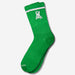 Woof! Try out these cozy, green socks, fit with a white gym stripe along the top. Followed up below by a silhouette of a howling dog on both sides of the upper-ankle. Made with 95% organic combed cotton for comfort, and reinforced in all the right areas for extra stretch and durability.