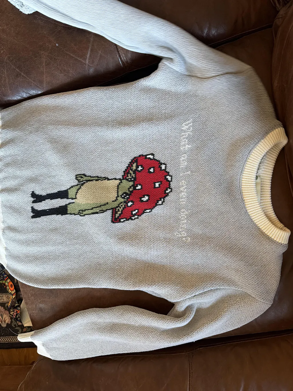 We're back with another design in collaboration with best-selling author and artist, Maybell Eequay. This cozy, heavy-knit sweater is knit in grey, with white trim and and text reading, "What am I even doing" (something we ask ourselves daily) Followed by the iconic, tender, affirming Little Frog - front and center.