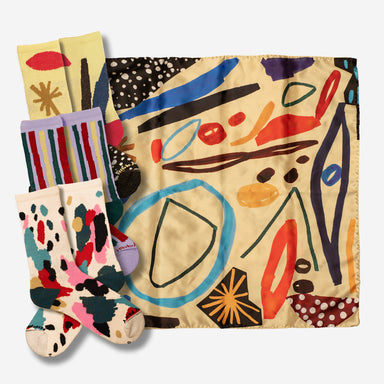 Step into Ashley Mary's vibrant world with our new collection of socks + an Italian silk scarf, inspired by Ashley's iconic paintings. These colorf...