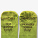 New socks made in collaboration with artist and best-selling author, Maybell Eequay. Featuring her iconic Little Frog - wearing tall black boots and sitting atop a boulder, surrounded by by a green landscape and blue skies. Across the tops of the feet, the text reads "Its going to be" "a really good day" as a gentle reminder every time you're looking down.