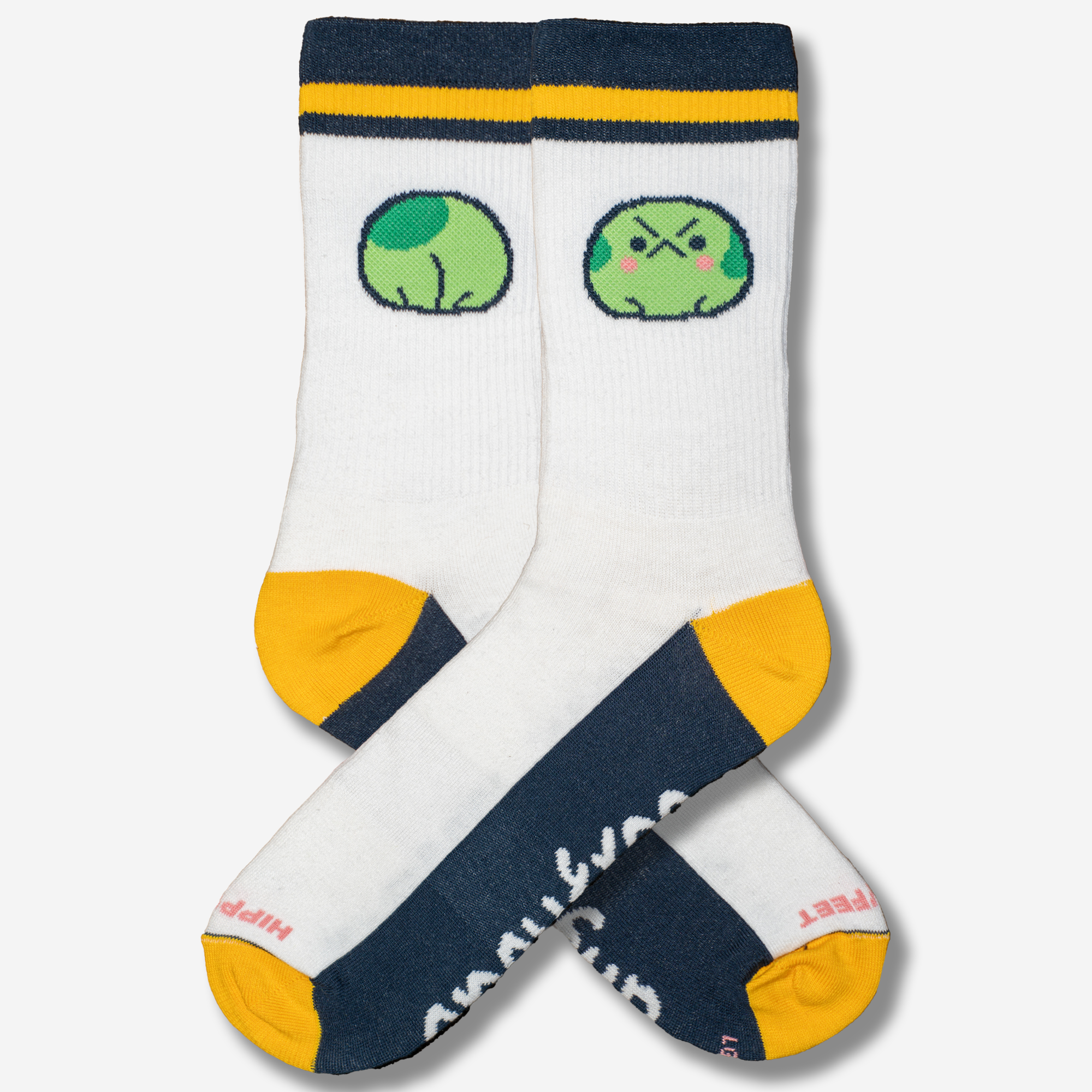 Brand new socks in collaboration with @angyfrog. These combed cotton crews feature the iconic "angy" frog along the sides of the ankle. One side displays the front of the upset frog and the other side shows the back of the frog, cheeks and all. This pair is fit with yellow and blue trim on a bleach white base, as well as the text "angyfrog" on the bottom of the foot