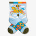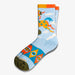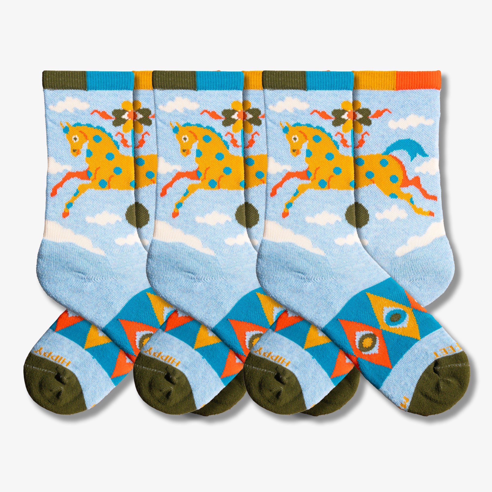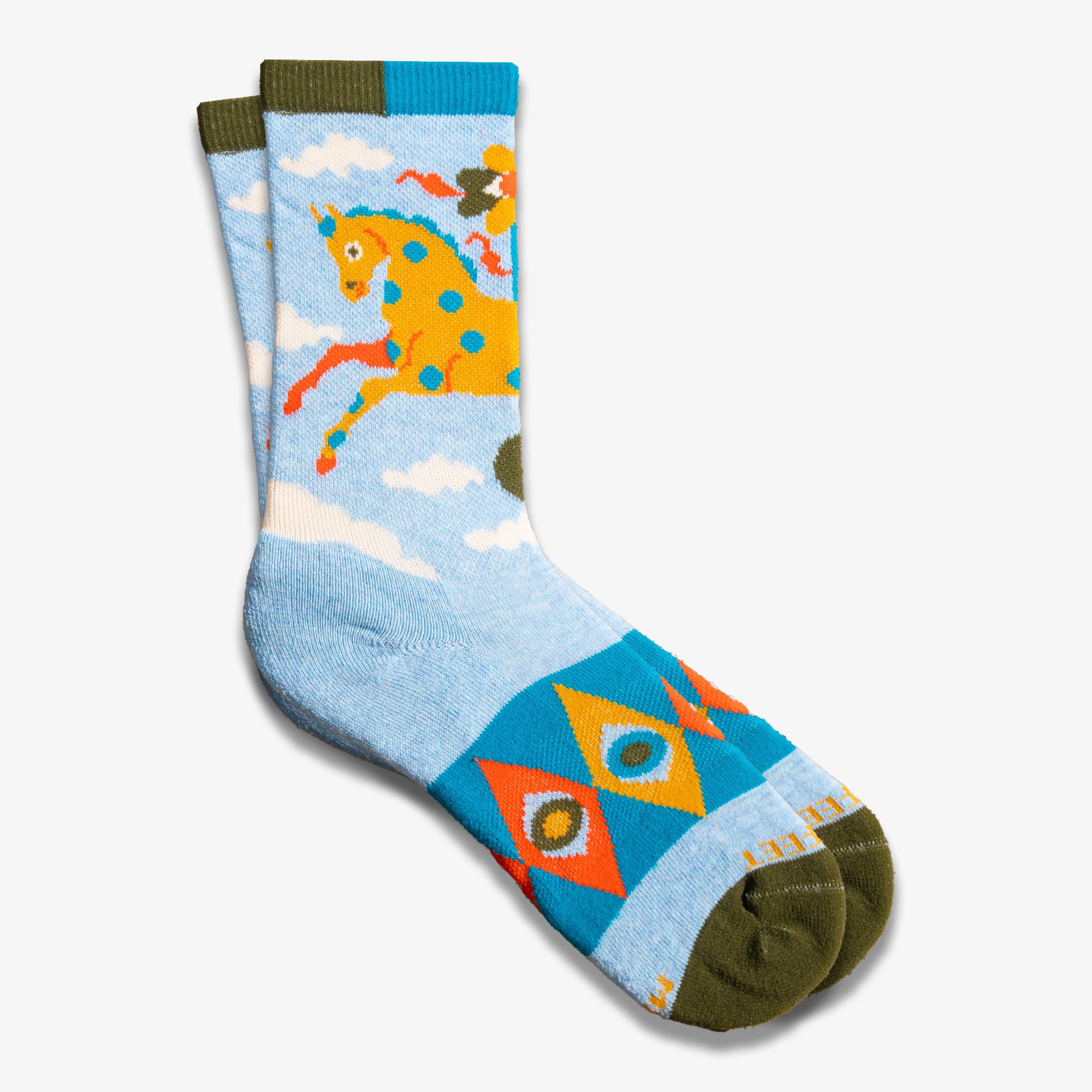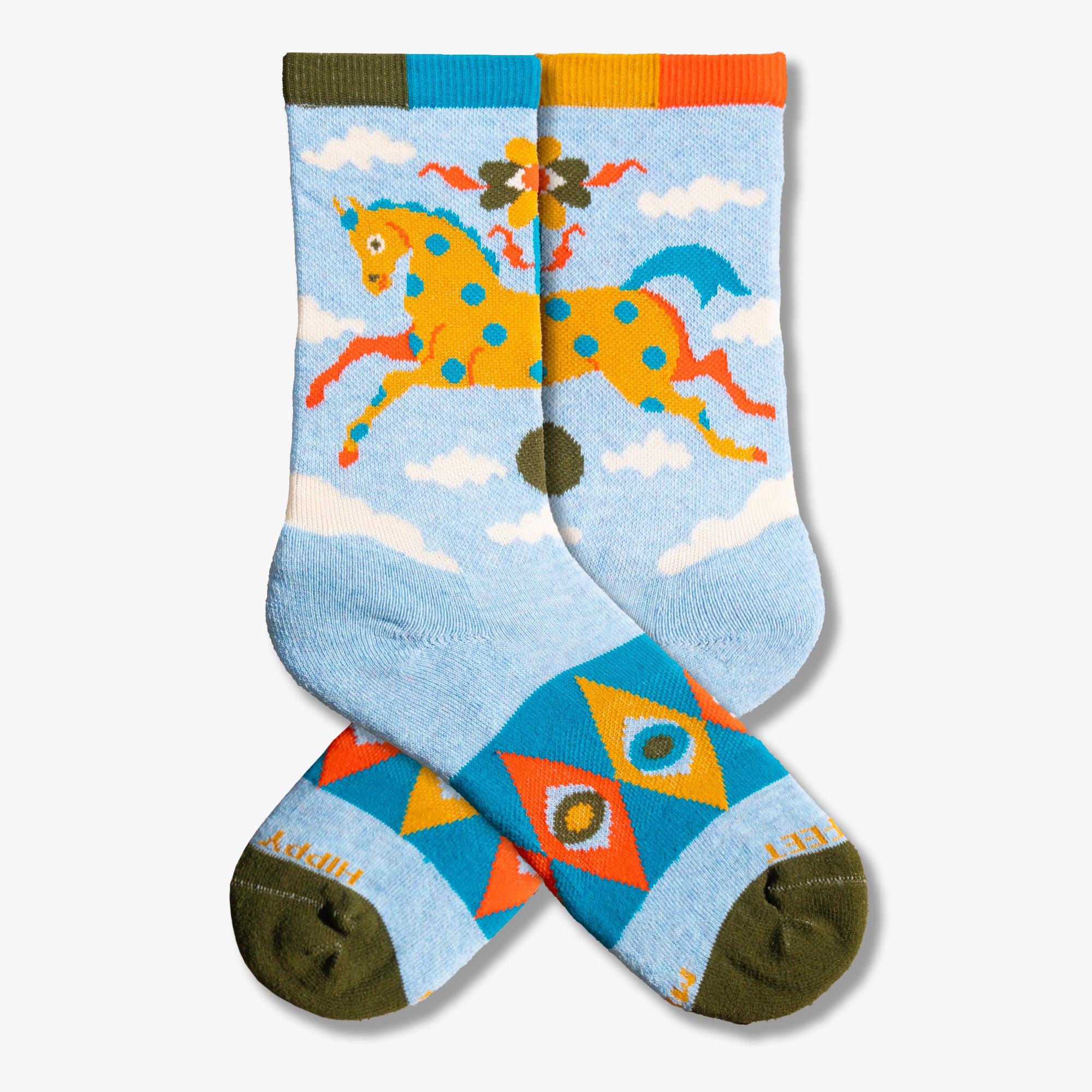 On these cozy crew socks, find an orange carousel pony with bright blue spots prancing above the ankle, galloping through the sky. Below, wide-eyed geometric motifs wrap around the foot in bold, decorative colors. A light sky-blue base sets the scene, while mossy green toes and a multicolor cuff finish the ride with a playful twist.